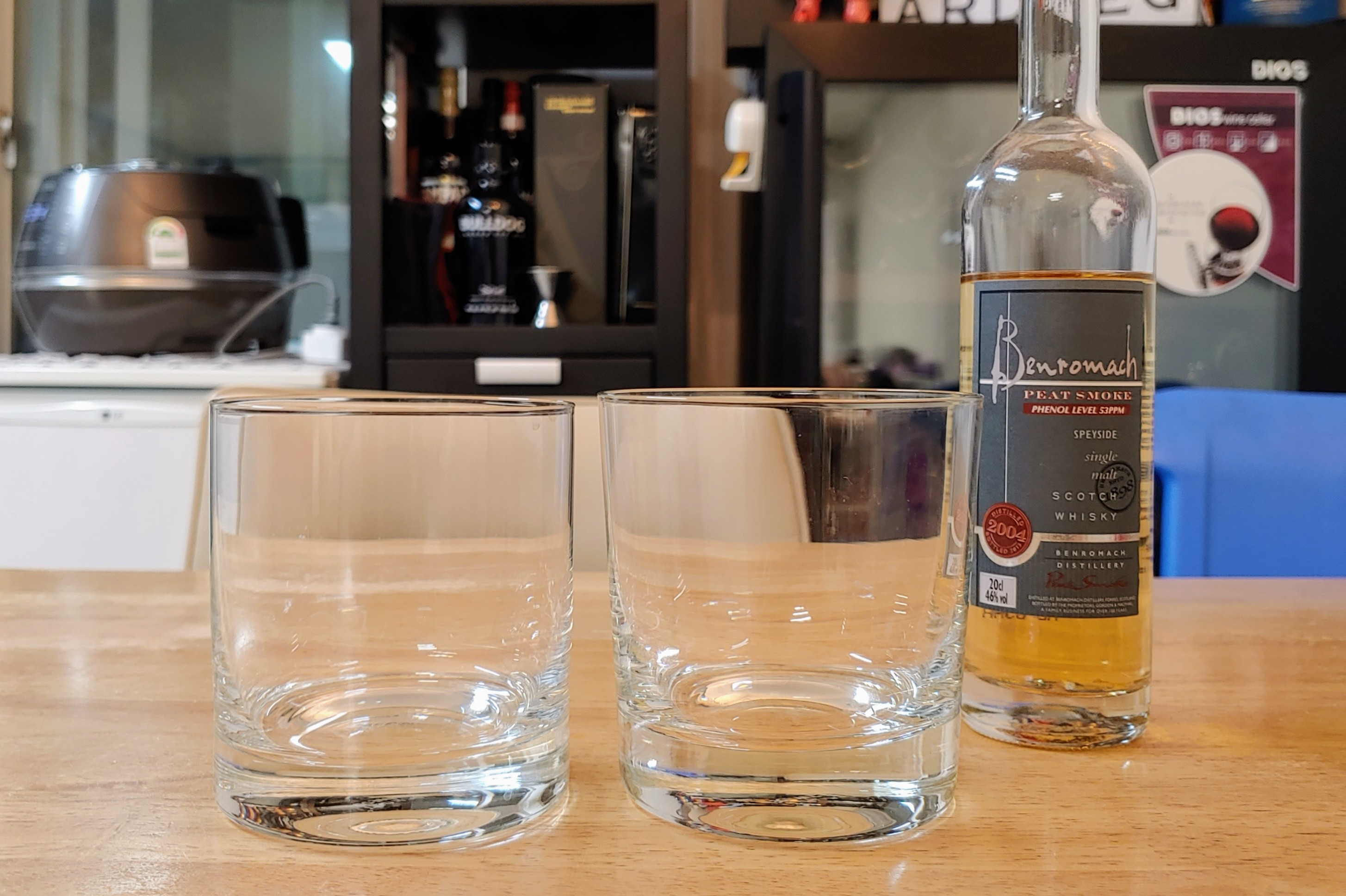 얼음을 담을 쇼트 즈위젤 온 더 락 글라스와 벤로막(Benromach) 위스키도 준비합니다.