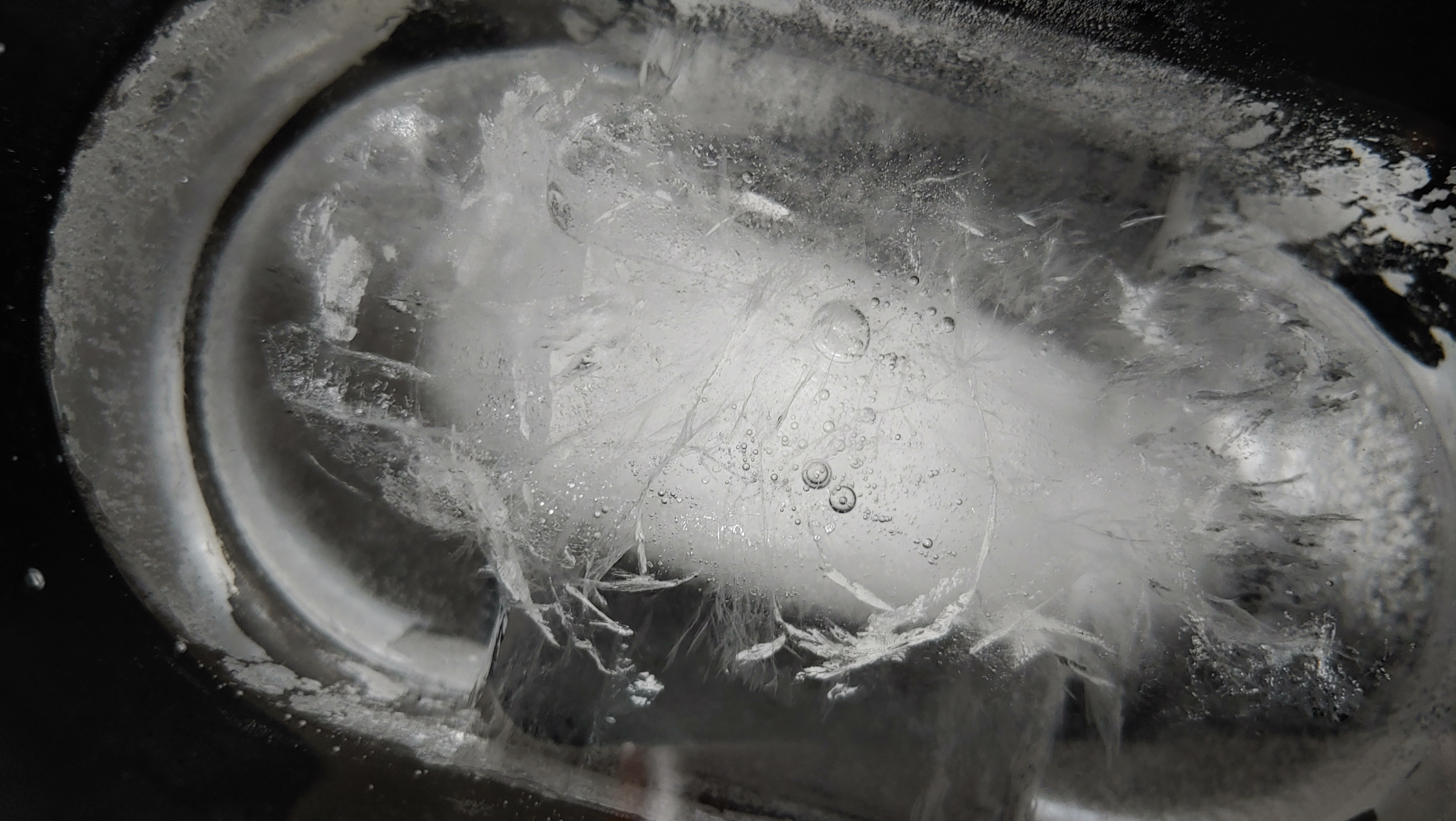물받이 아래 얼음 가운데엔 역시나 두터운 공기층이 자리 잡고 있습니다. 몰드 윗부분부터 천천히 얼면서 공기를 아래로 밀어낸 거죠.