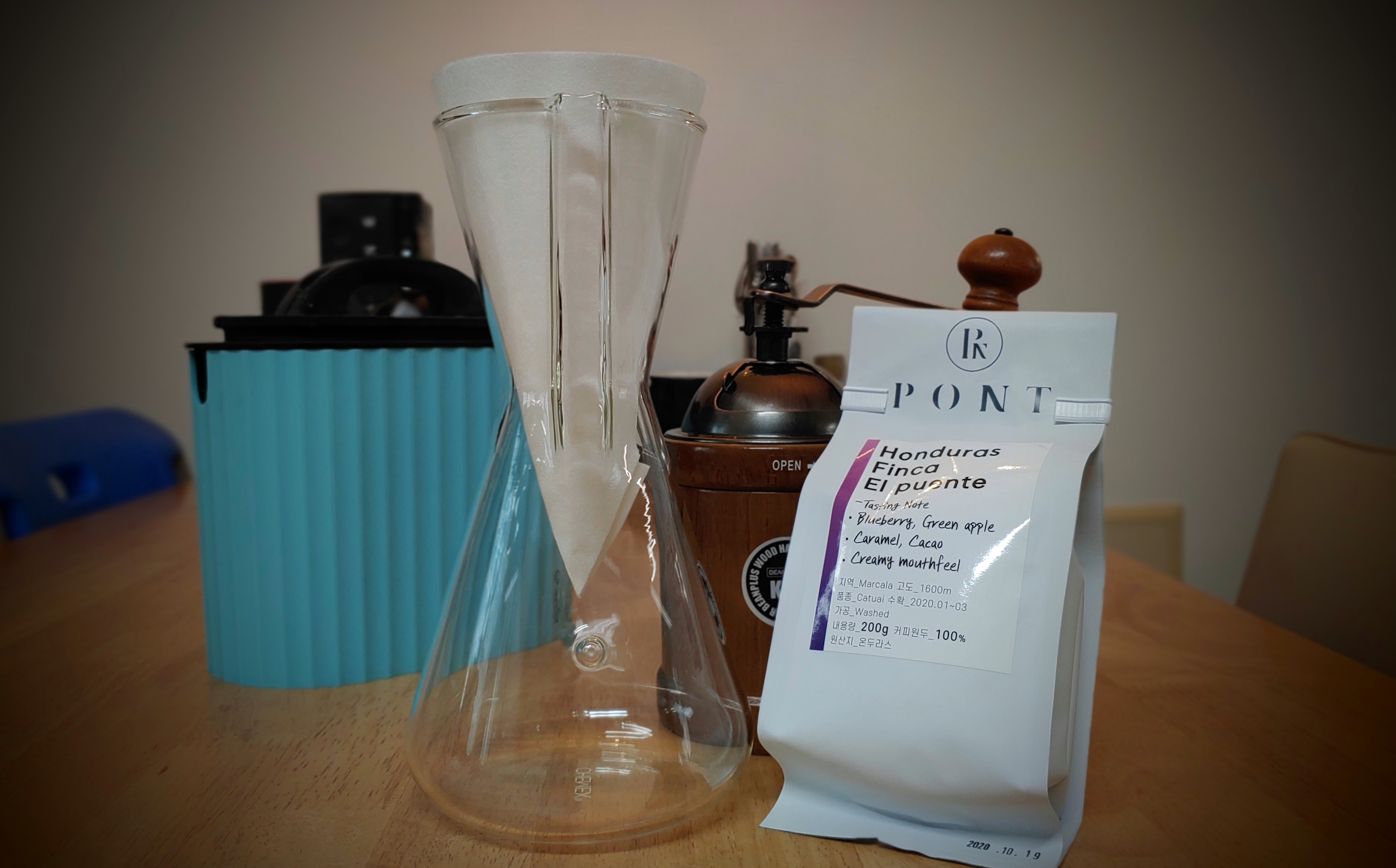 일단 커피를 내리기 위한 준비. 원두와 핸드밀, 그리고 케맥스 드리퍼를 꺼냅니다.