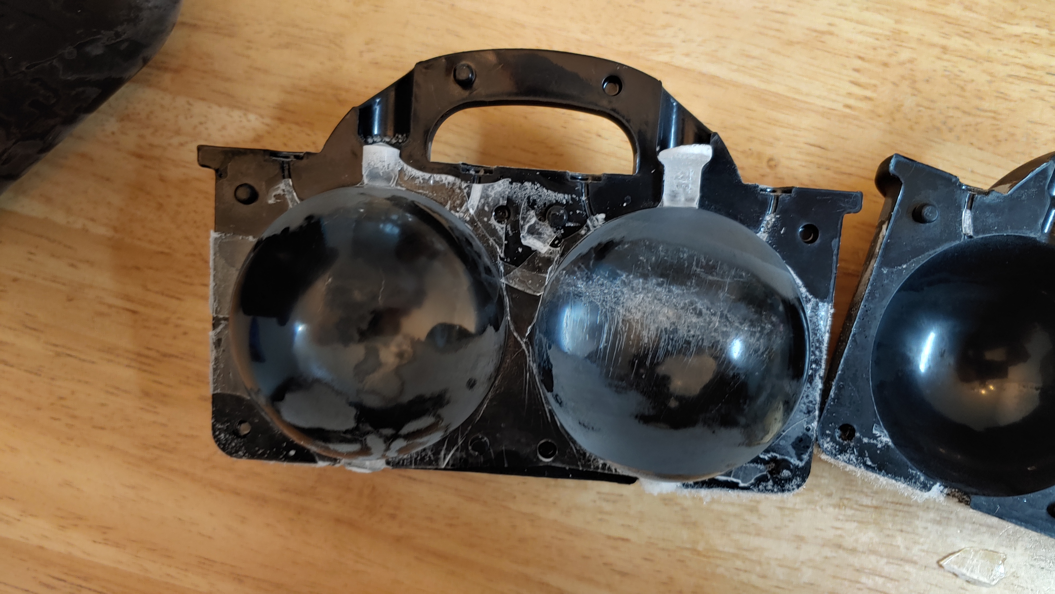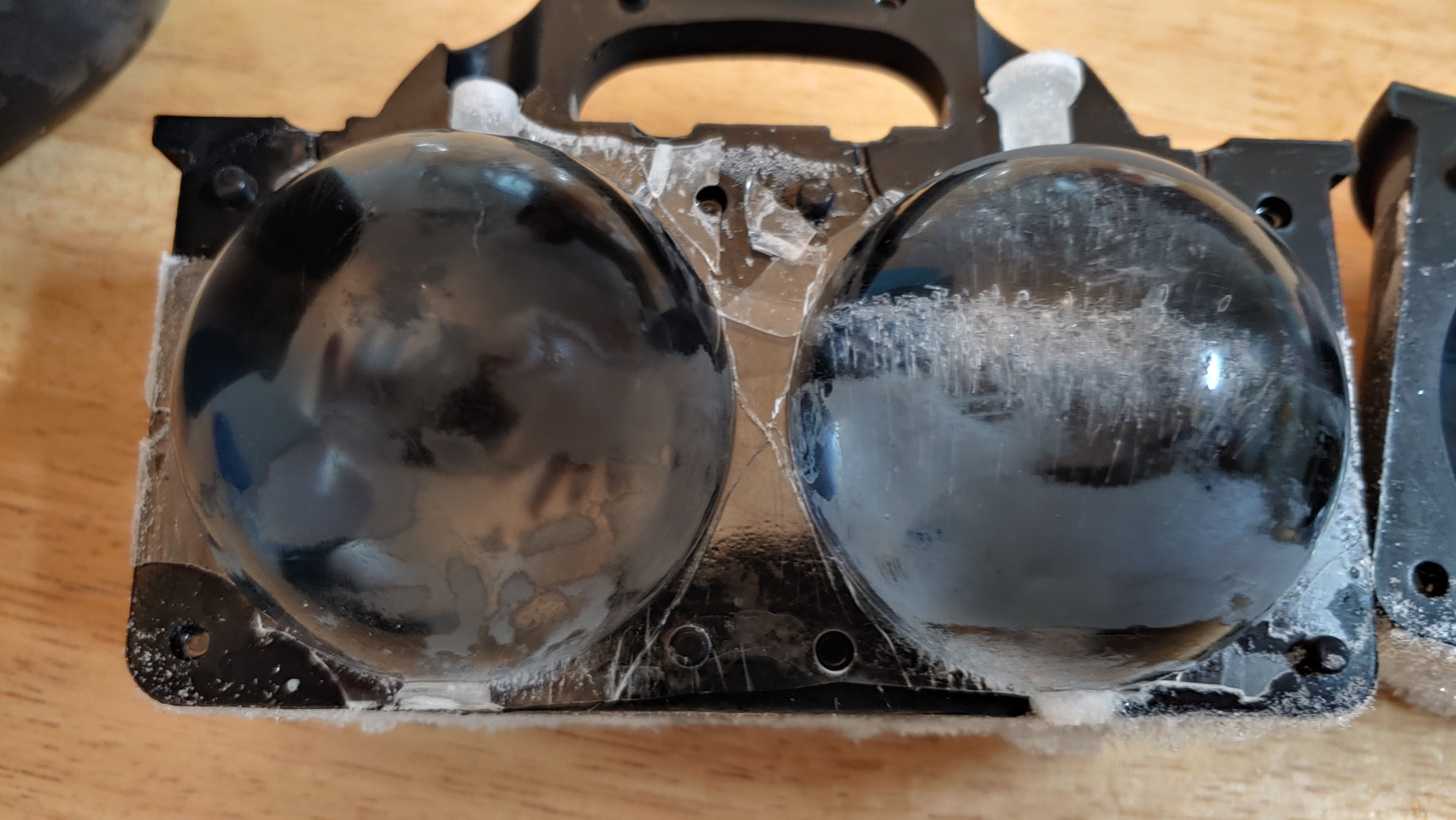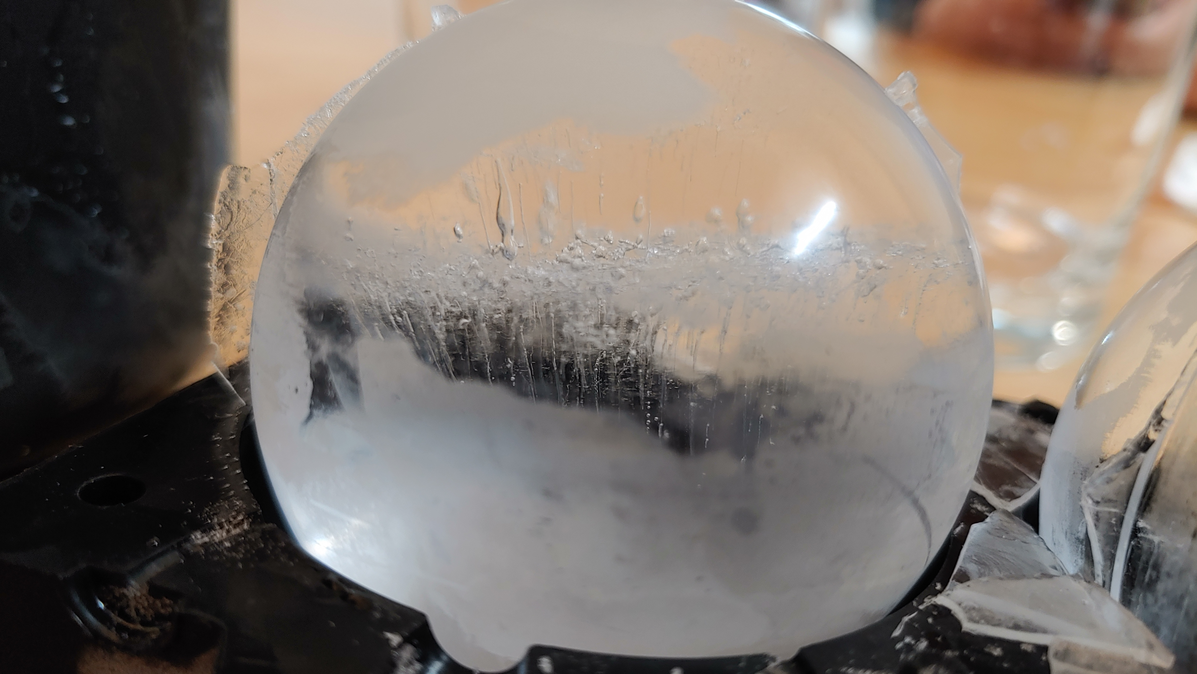 원래 따뜻한 물을 영하 12-14도에서 천천히 얼려야 가장 단단하고 투명한 얼음을 얻을 수 있다고 했는데, 대충 미지근한 물 넣고 원래 냉장고 설정 온도인 영하 20도에서 얼려서 그런 것 같습니다. 그래도 공기층의 두께가 상당히 얇고 면적도 작습니다. 기존 조* 아이스볼은 얼음의 절반 이상이 뿌연 공기층이었는데 말이죠.
