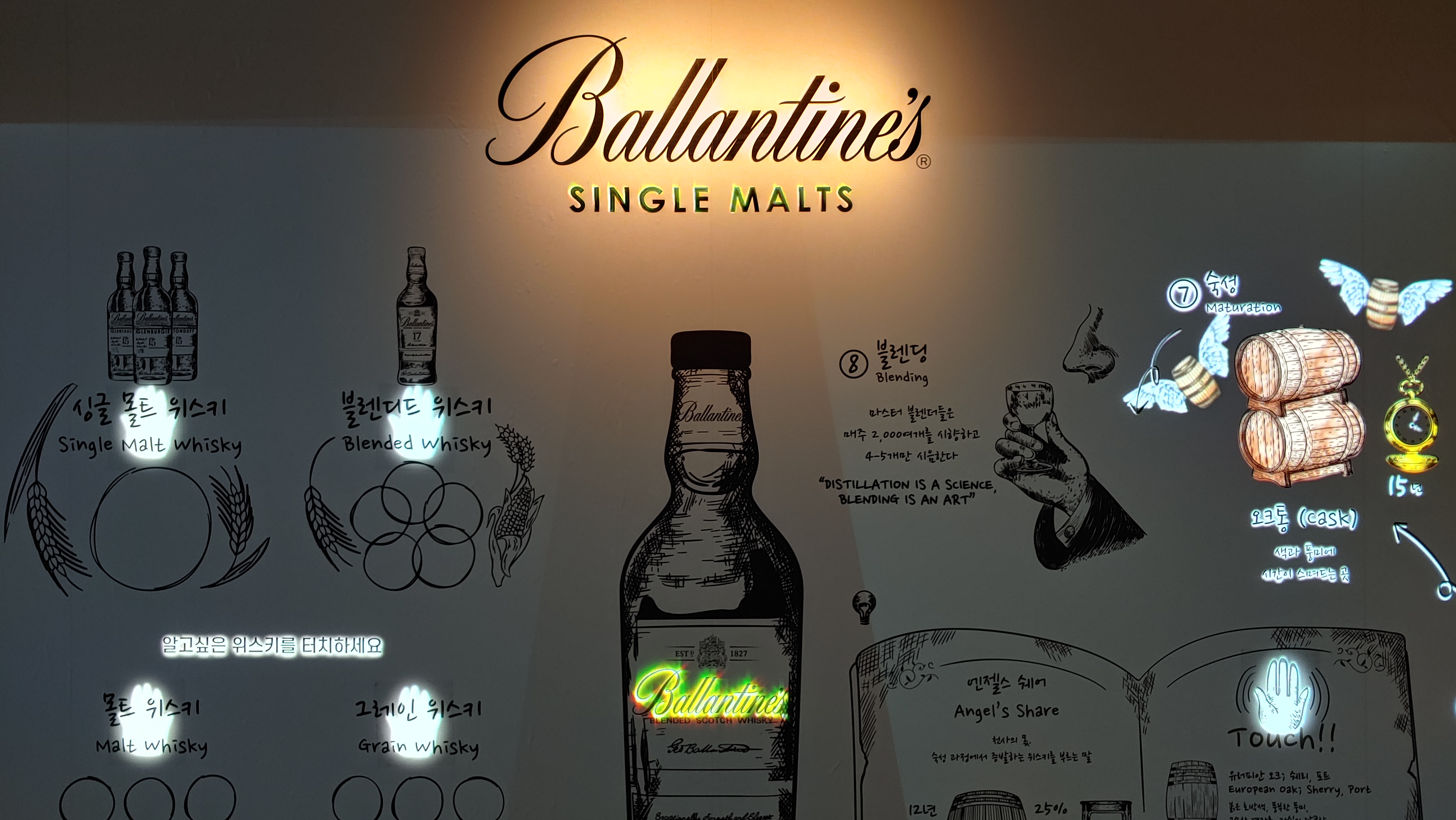 첫 번째 섹션에서는 위스키 제조 과정을 소개합니다. Touch라고 쓰인 손바닥 부분을 누르면 순서대로 불이 들어옵니다.