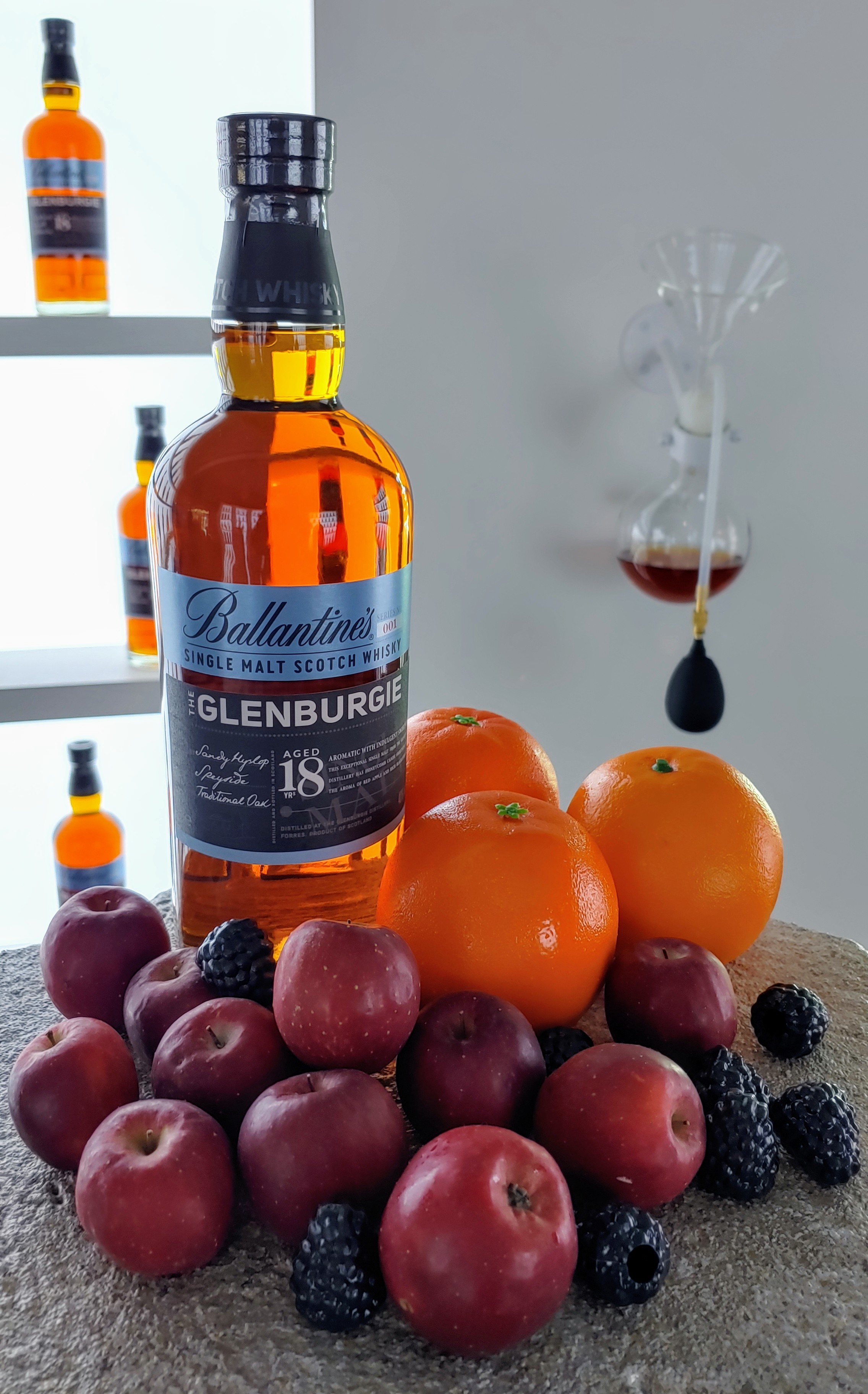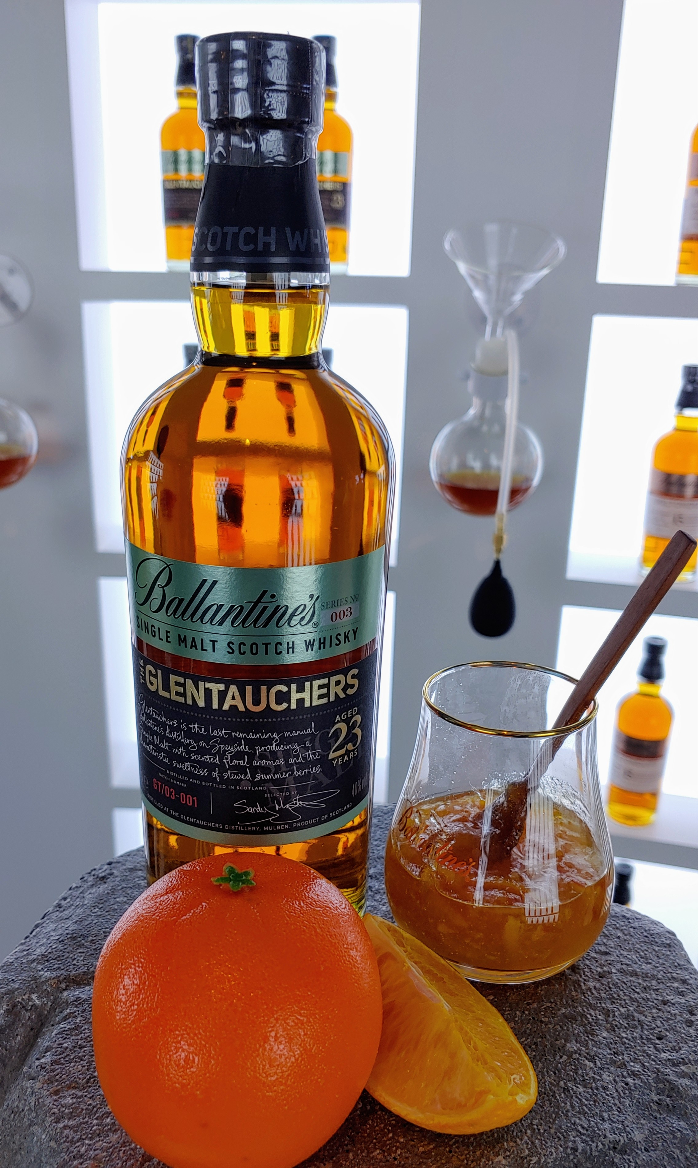 글렌토커스 23년. 전시된 위스키 중 가장 고숙성입니다. 오렌지와 오렌지 마멀레이드가 함께 전시돼 있네요. '풍부한 라즈베리 맛, 달콤한 오렌지 마멀레이드와 섬세한 꽃 향, 달콤하고 섬세한 피니쉬'가 공식 소개입니다.