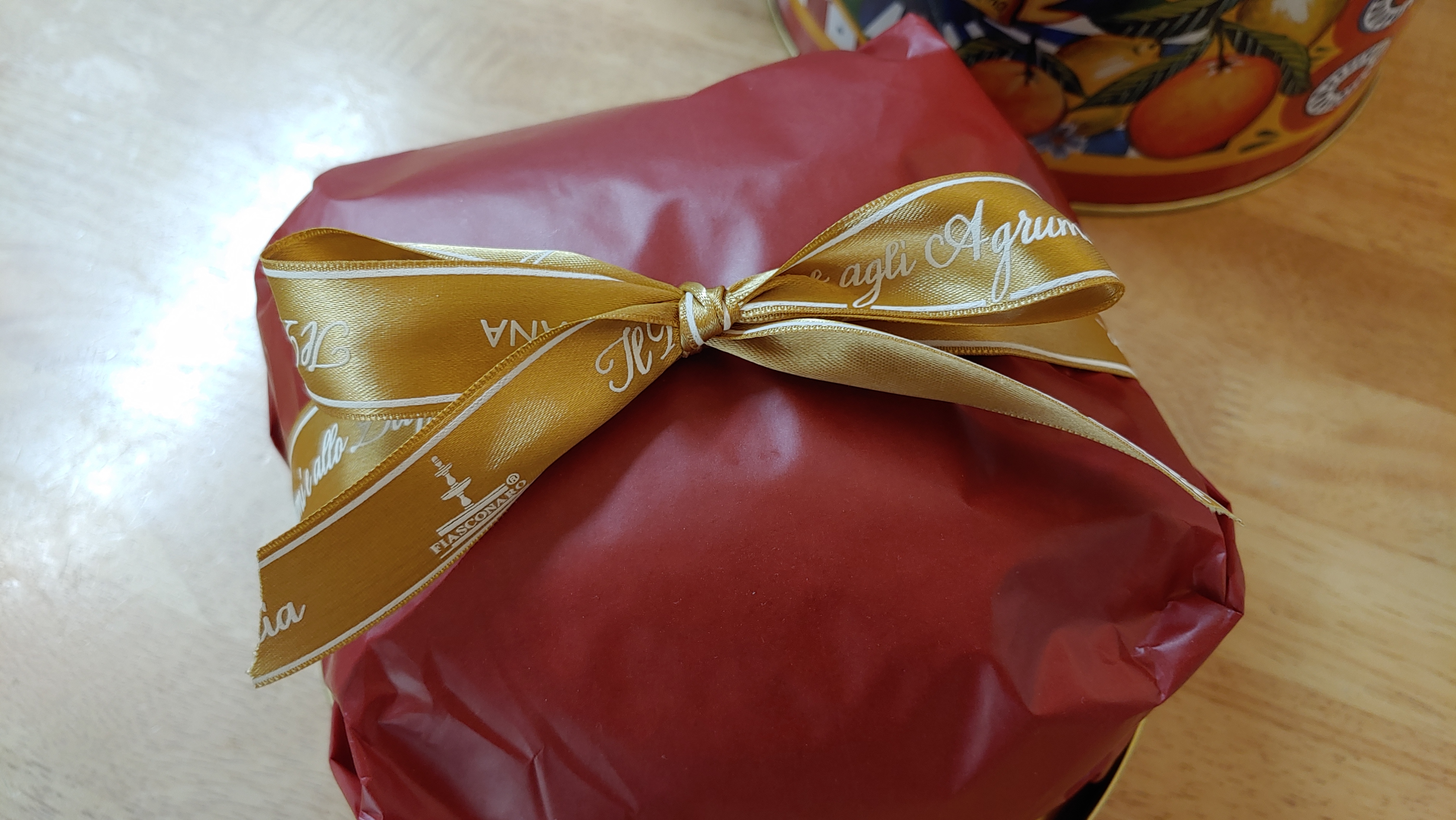 단정한 붉은색 포장지에 금빛 리본이 깔끔하게 묶여 있습니다.