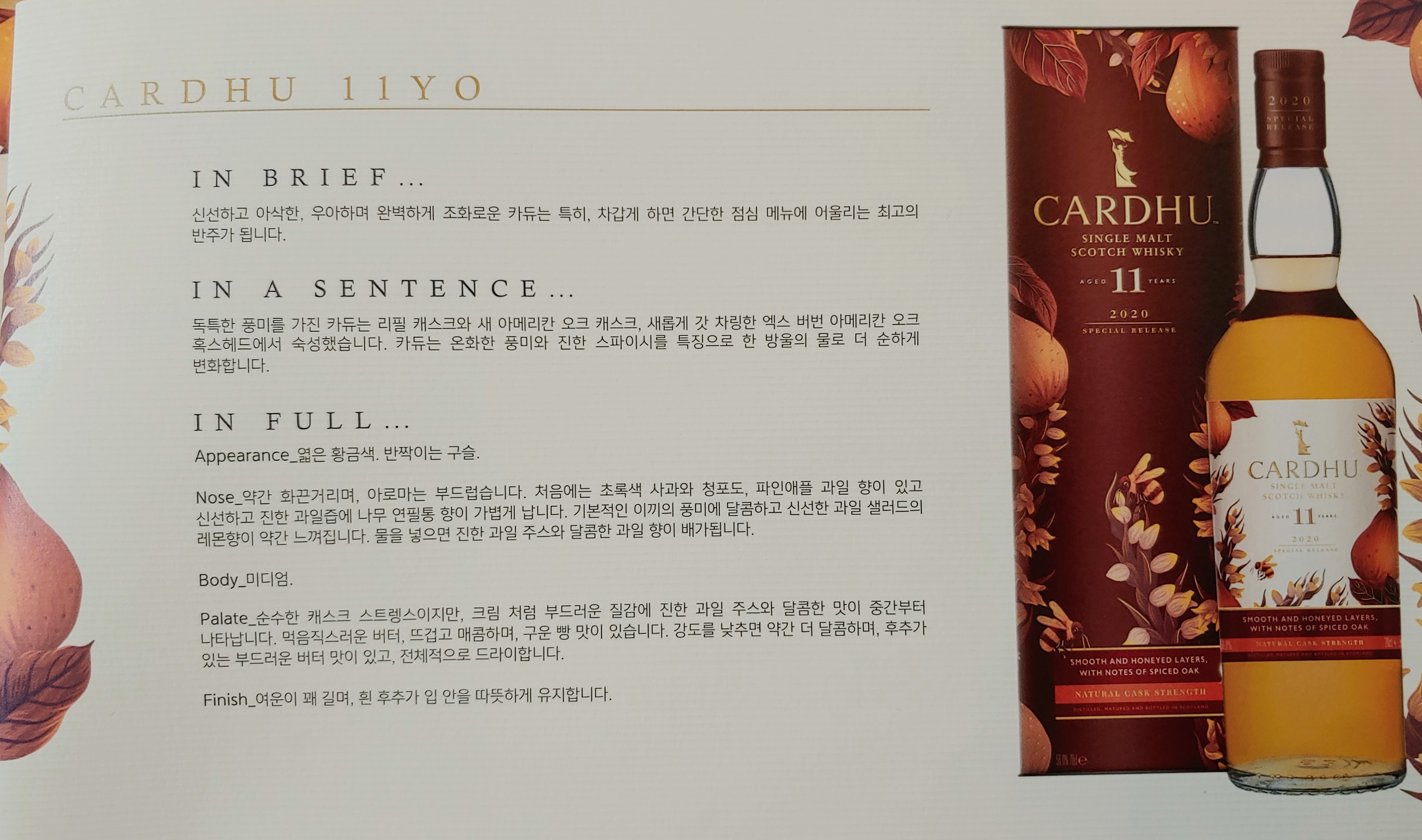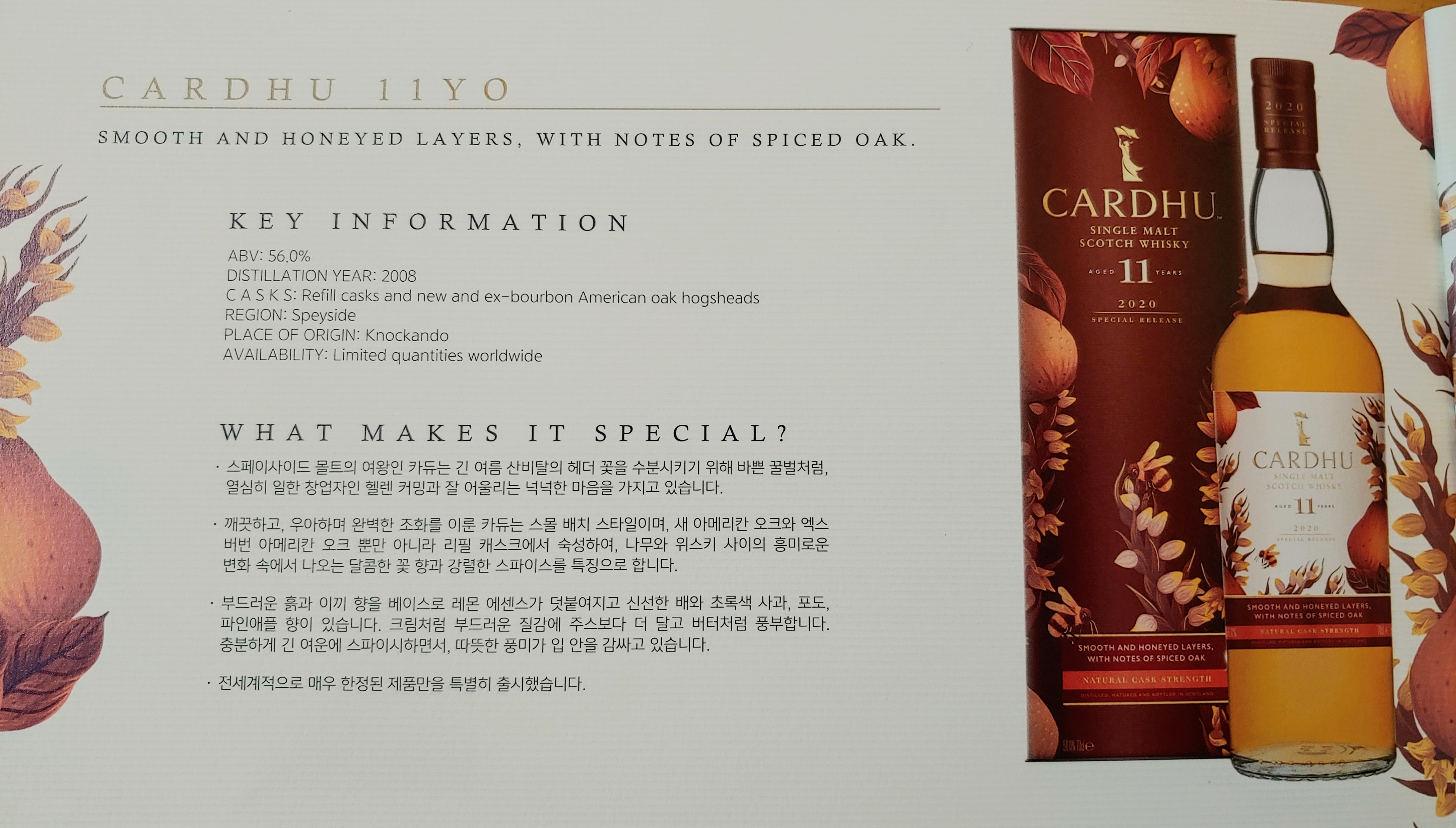 그렇게 선택한 단 한 병, 카듀 11년(Cardhu Aged 11 Years) 입니다. 작년에 라인업 중에서도 한정적으로 풀린 카듀 14년을 못 산 게 아쉽기도 했거니와, 이 녀석도 맛이 상당히 좋다는 얘기가 많더라고요. 그리고 요즘 피티한 위스키에 손이 잘 안 가다 보니, 탈리스커와 라가불린은 이미 구매한 2019 SR로도 만족할 수 있을 것 같았습니다. 탈리스커는 숙성기간이 짧은 것도 아쉬웠고요.