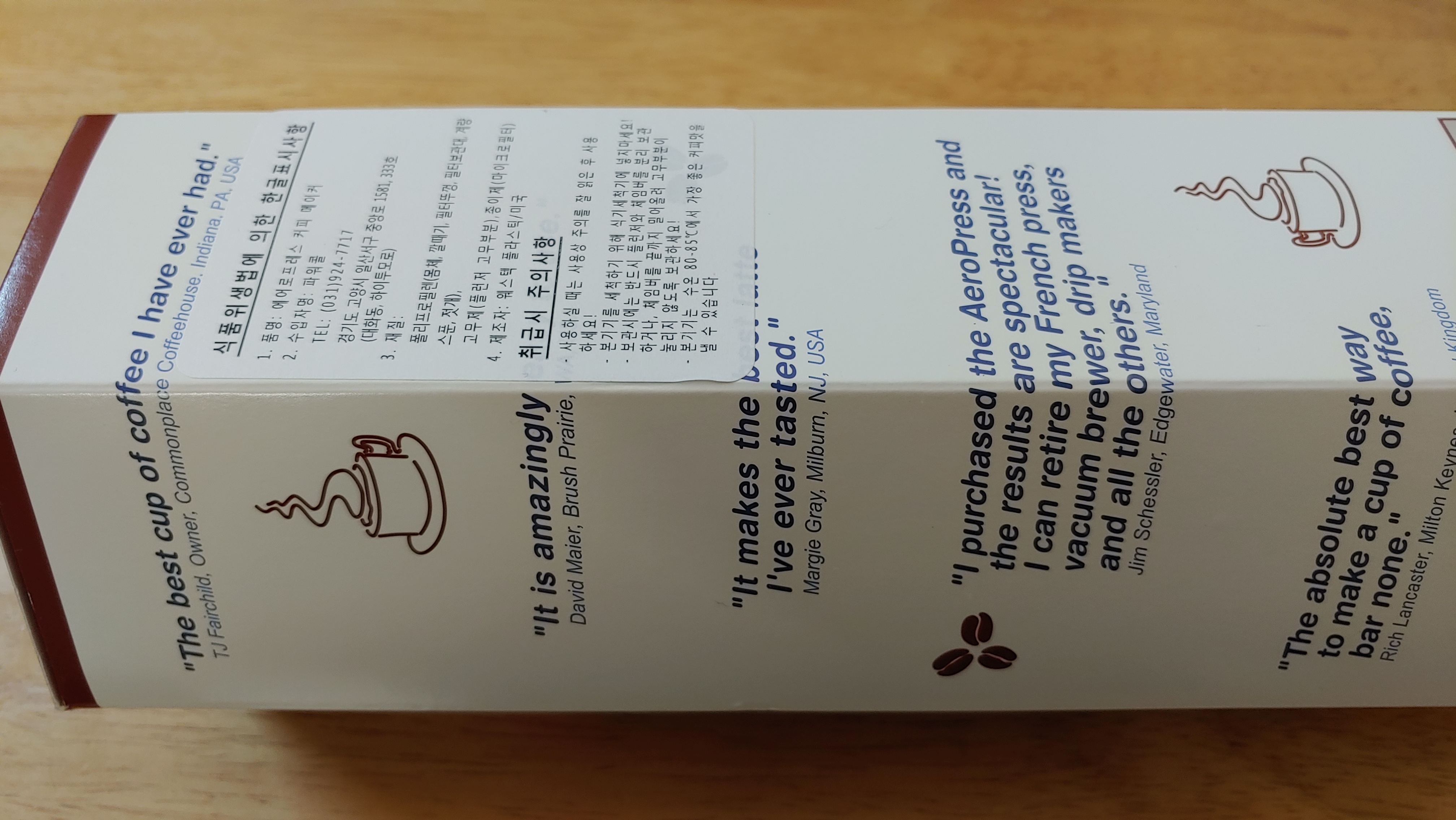 케이스 자체가 광고판 같아요. 커피 전문가들의 추천사들이 가득 적혀 있습니다. 아무래도 나온 지 얼마 안 된 제품이다 보니 신뢰를 얻기 위한 나름의 자구책이 아니었나 싶네요ㅋㅋ