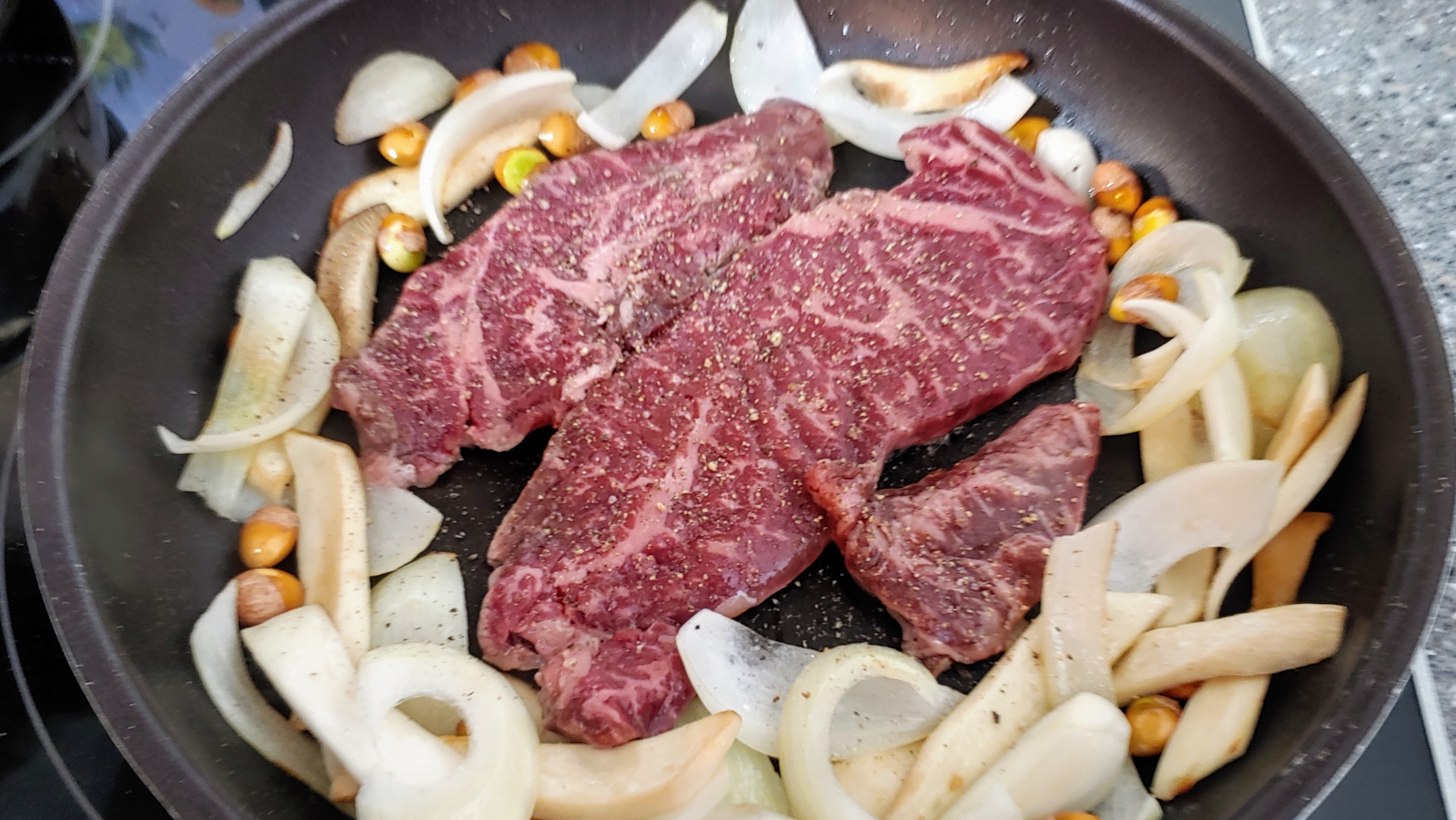 양파 등 야채를 먼저 굽다가 프라이팬 온도를 좀 높여서 고기를 올렸다. 그리고 적당히 구워진 후 식탁으로 옮겨 마저 구우면서 취식. 먹느라 등심은 찍지도 못함;;;