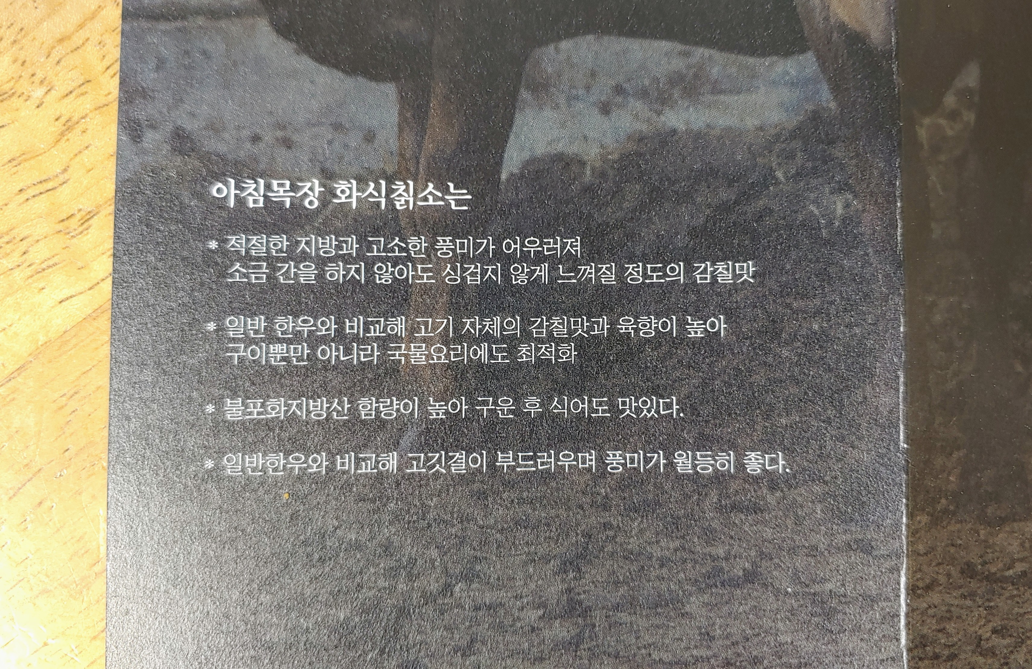 소에게 주는 여물에 상당히 신경을 쓰시는 듯. 한우 등급 부여 시 기준이 되는 마블링을 키우기보다는 소가 건강하게 자라서 쇠고기 본연의 맛이 좋아지도록 하는 데 중점을 두는 듯싶다.
