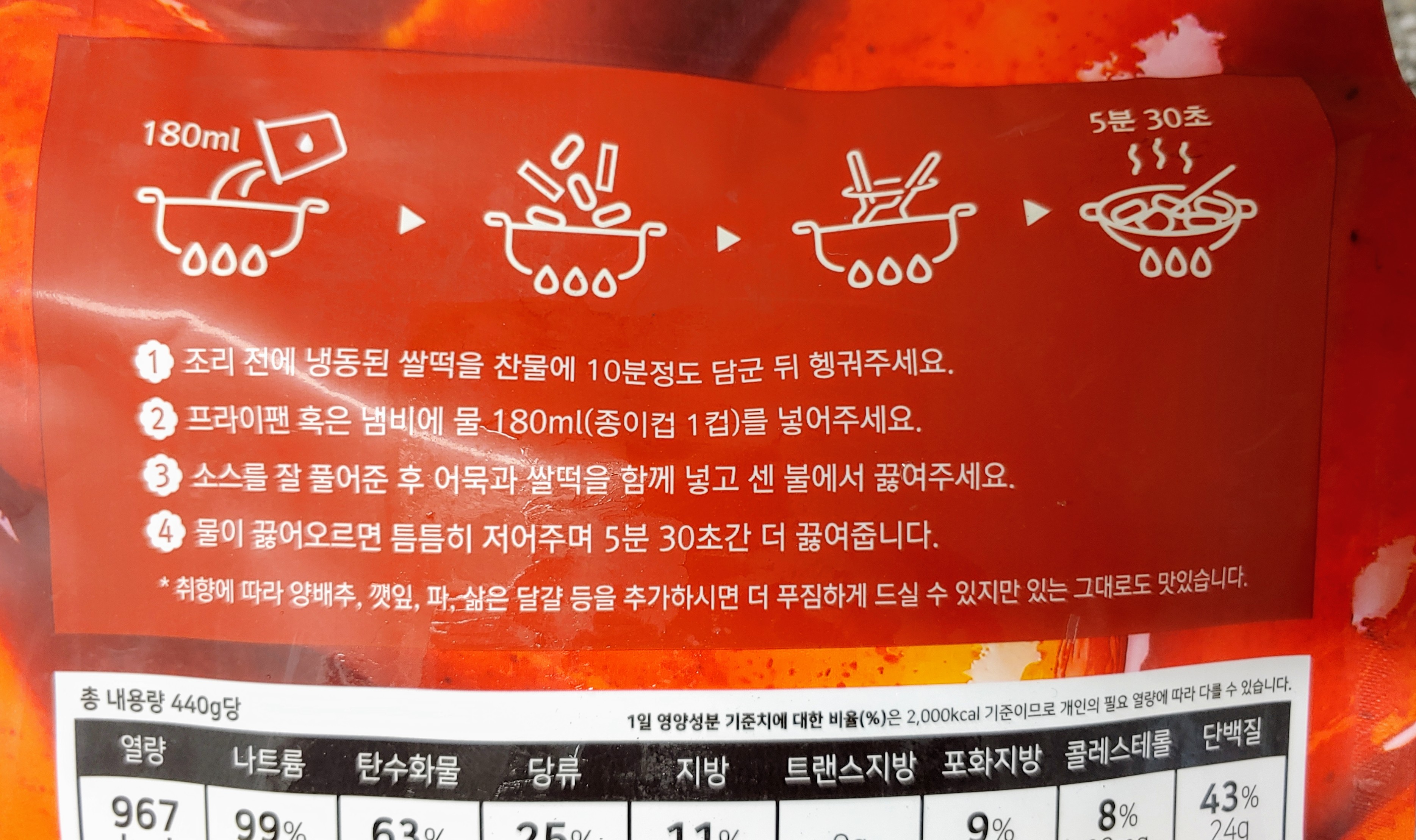 밀키트 1개 당 180ml의 물과 함께 소스, 떡볶이, 어묵을 모두 함께 넣고 끓이면 된다. 아, 떡은 끓이기 전 10분 정도 물에 담가 둔다. 그러면 얼음이 녹아 떡이 하나씩 떨어지면서 살짝 부드러워지는 느낌이 든다.