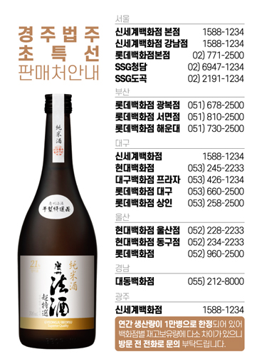 판매처가 한정적이다보니 경주법주를 만드는 금복주 홈페이지에서 판매처 안내 팝업을 띄울 정도다. 서울의 공식 판매처는 백화점 세 곳과 SSG청담/도곡 뿐. 그런데 얼마 전부터 CU 스마트 스토어를 통해 주문할 수 있게 되었다. 원하는 술을 집 앞 편의점에서 받을 수 있는 편리한 세상.