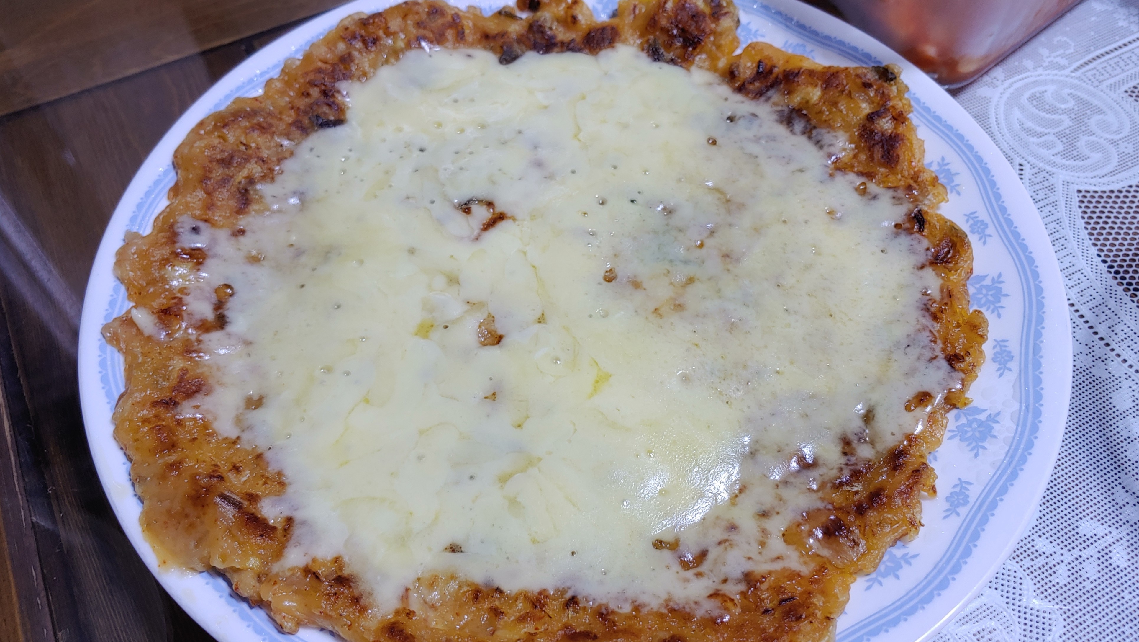 김치 빈대떡에 피자 치즈를 올려서 코리안 스타일 피자로. 반찬으로도 와인 안주로도 안성맞춤이다.