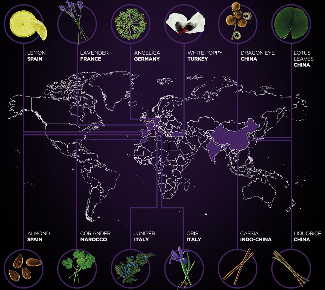 사용하는 12가지 식물은 이탈리아의 주니퍼와 오리스(oris)를 비롯해 스페인의 레몬과 아몬드, 프랑스의 라벤더, 모로코의 고수(corriander), 독일의 안젤리카(angelica), 터키의 흰 양귀비 씨앗(white poppy), 인도-차이나의 계피(cassia), 중국의 드래곤 아이(dragon eye), 연꽃잎, 감초(liquorice) 등 세계 각지에서 모였다. 과연 어떤 풍미를 드러낼 지 궁금...