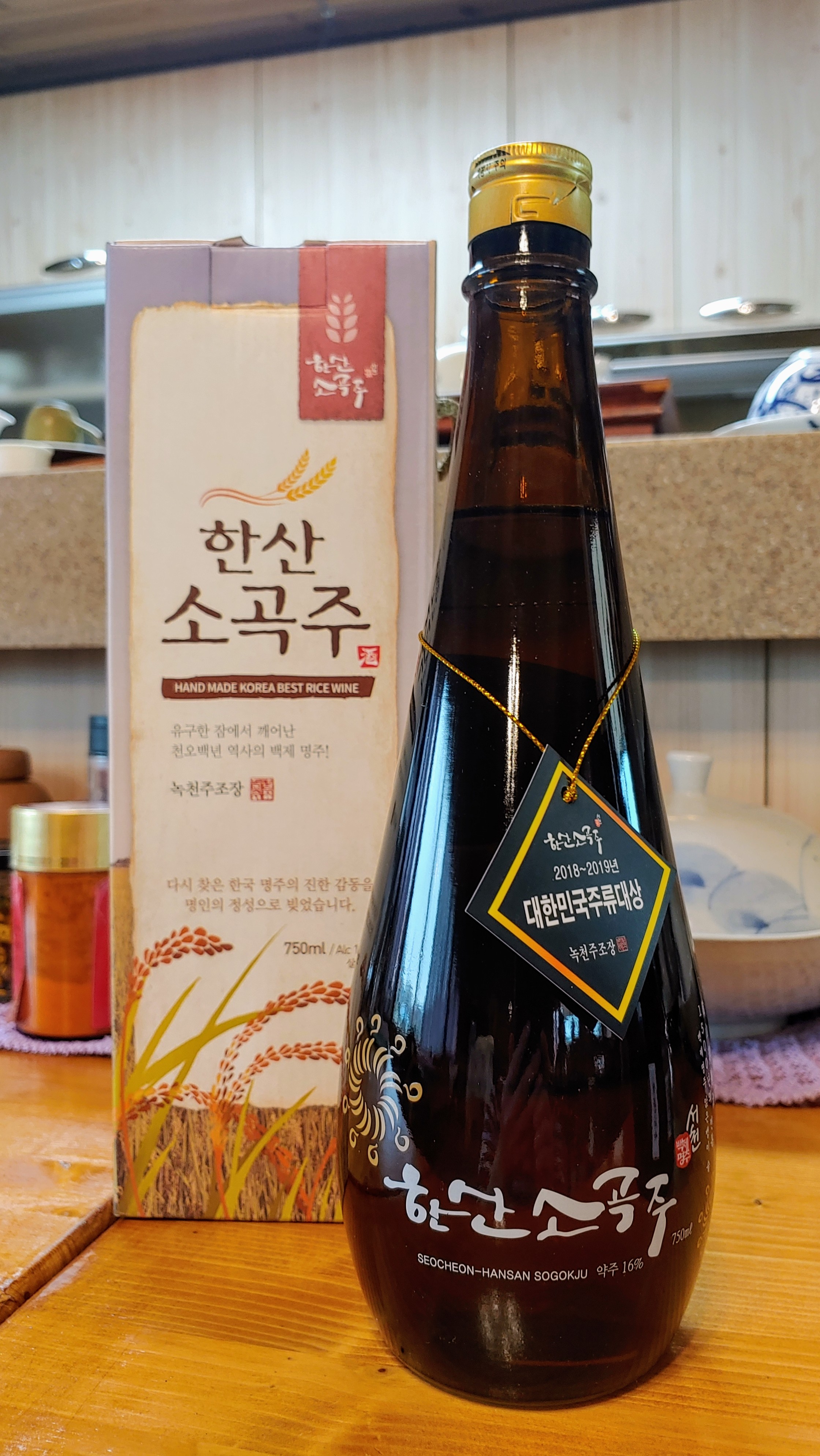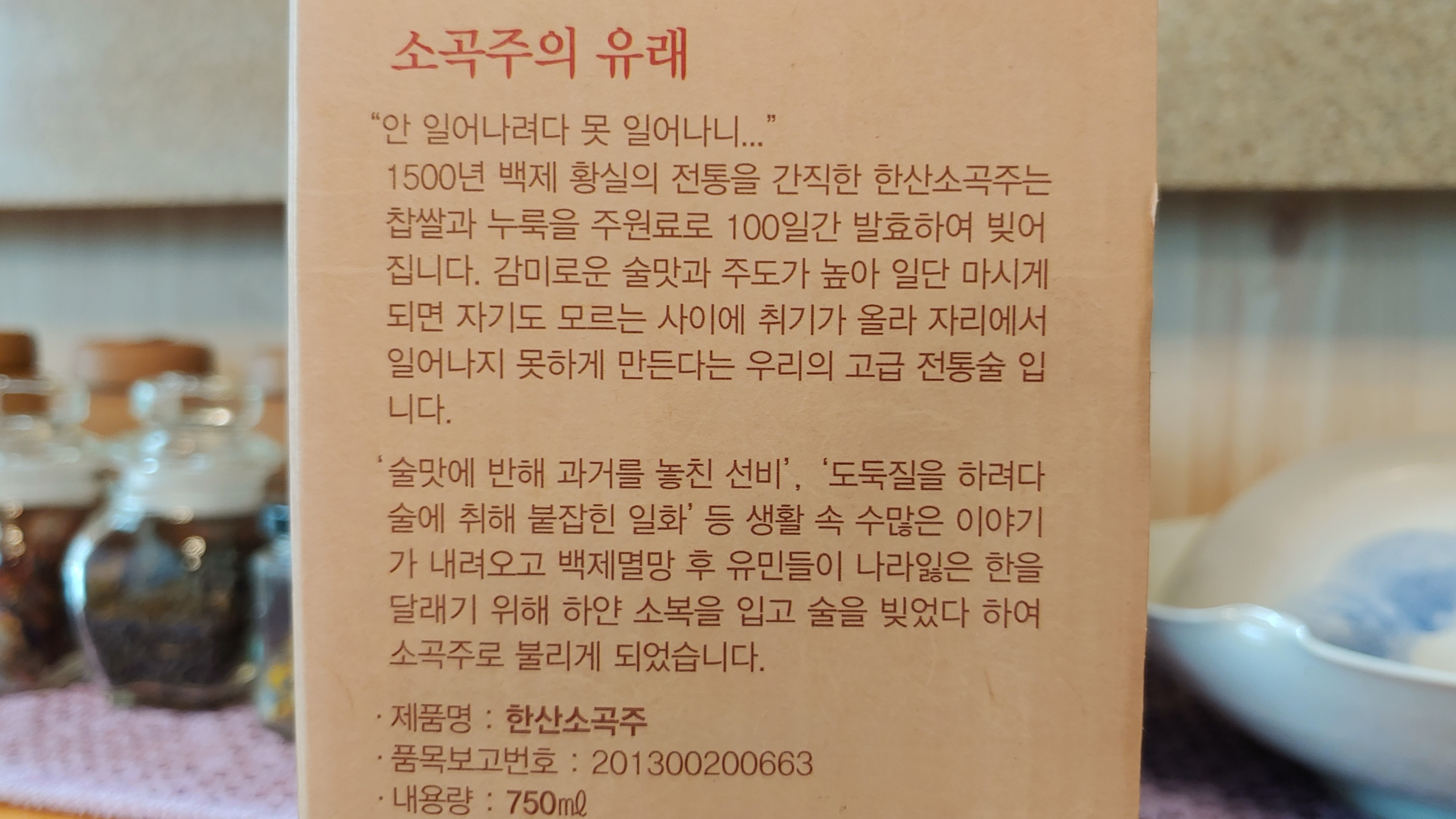 한산소곡주를 검색해 보면 다양한 제품을 볼 수 있는데, 위 패키지는 서천군에서 작은 양조장들에게 제공하는 공동 패키지라고 한다. 다른 양조장에서 같은 패키지를 쓴다고 놀랄 필요 없다. 서천군에서 공동 패키지를 만들 정도로 열심히 지원하고 있다고 생각하면 될 듯. 실제 40여 업체가 한산소곡주를 생산하고 있으며, 타 지역 전통주에 비해 활성화가 잘 되어 있는 것 같다. 내가 산 제품은 녹천 주조장 제품.