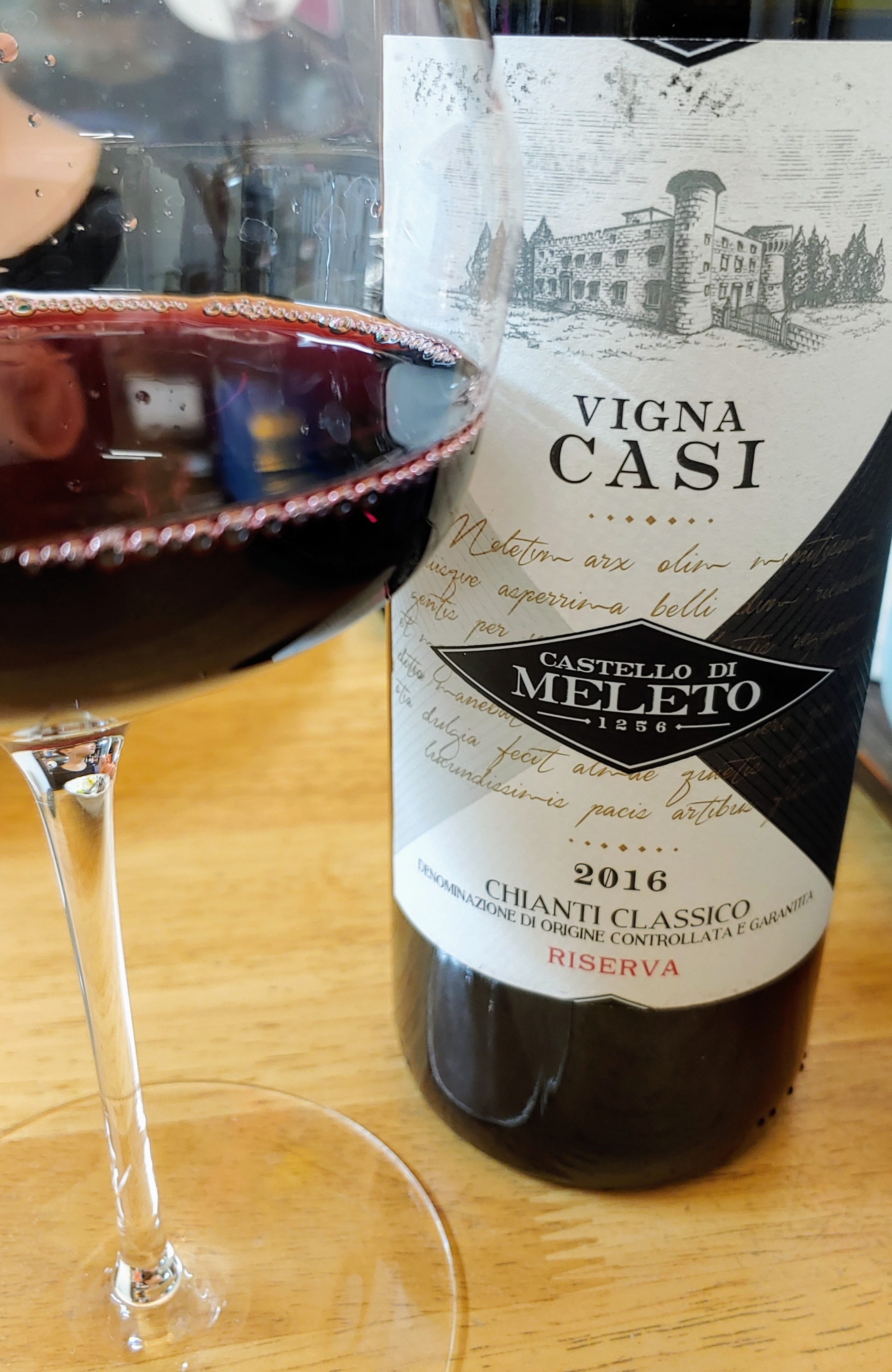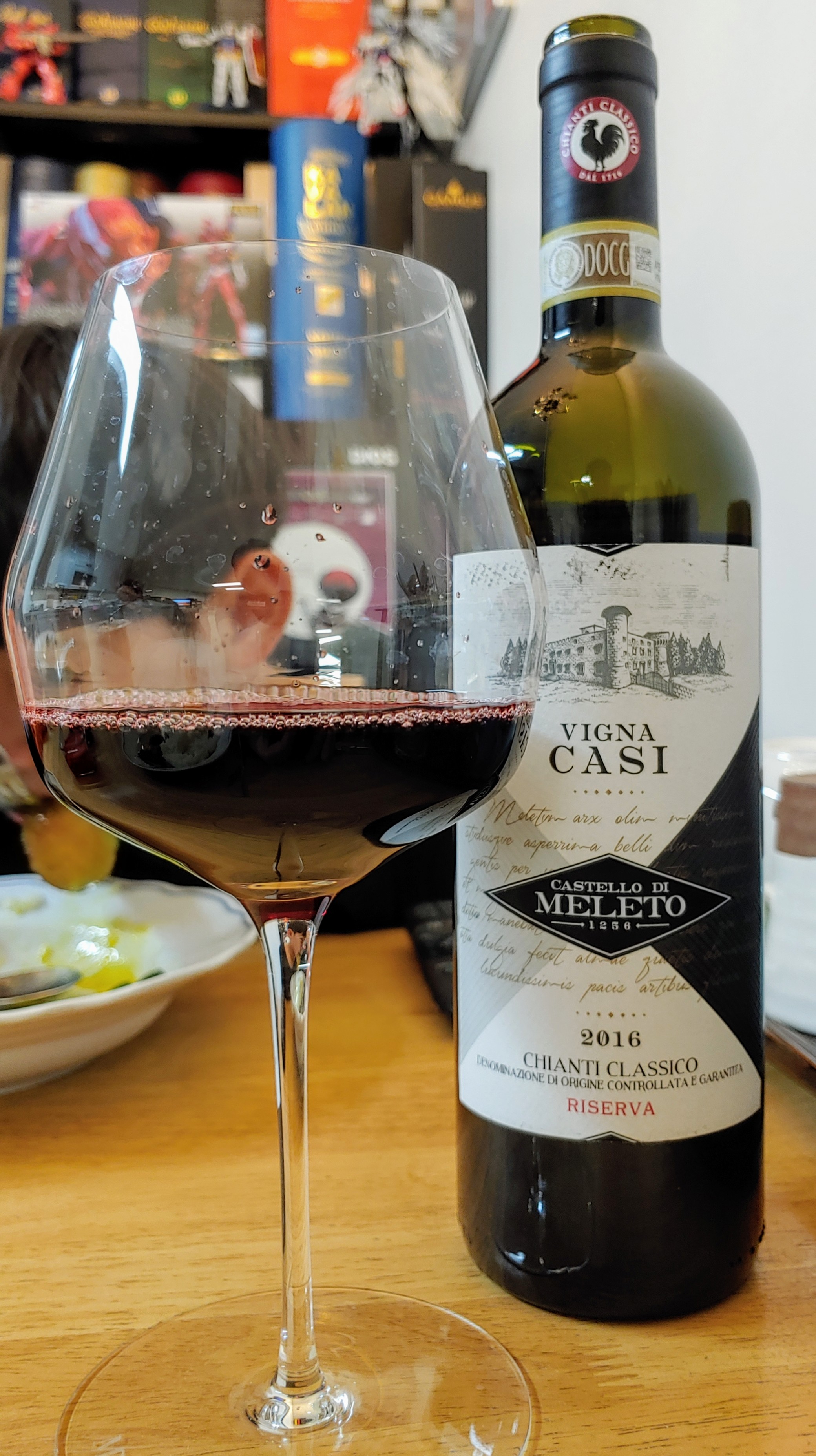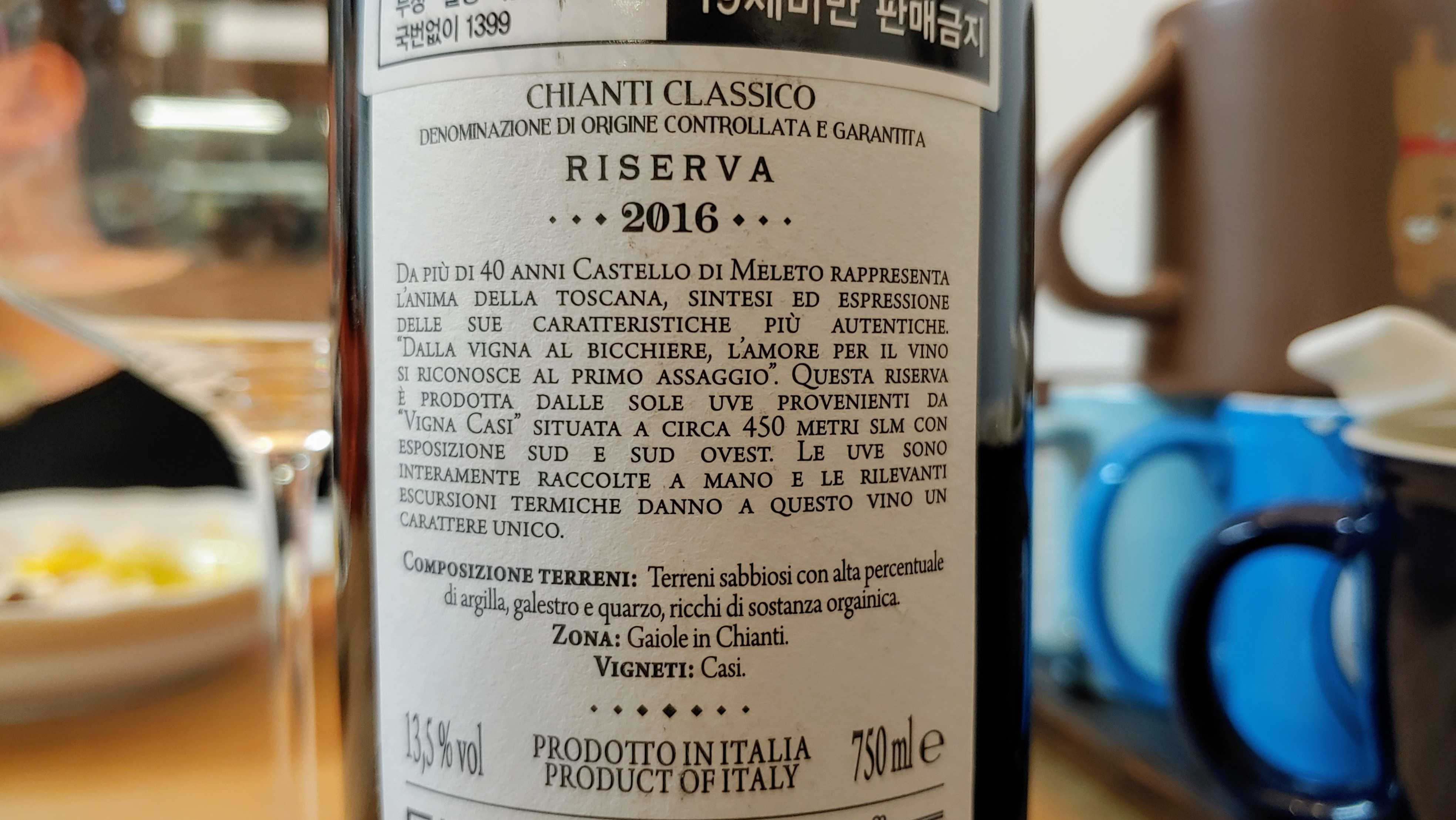 카스텔로 디 멜레토 비냐 카시 키안티 클라시코 리제르바(Castello di Meleto, Vigna Casi Chianti Classico Riserva). 개인적으로 데일리로 애정하는 키안티 클라시코의 리제르바 등급이다. 리제르바는 숙성 기간이 최소 24개월로, 일반급의 2배. 카시(Casi)는 이 와이너리가 보유한 포도밭(Vigna) 이름이다.