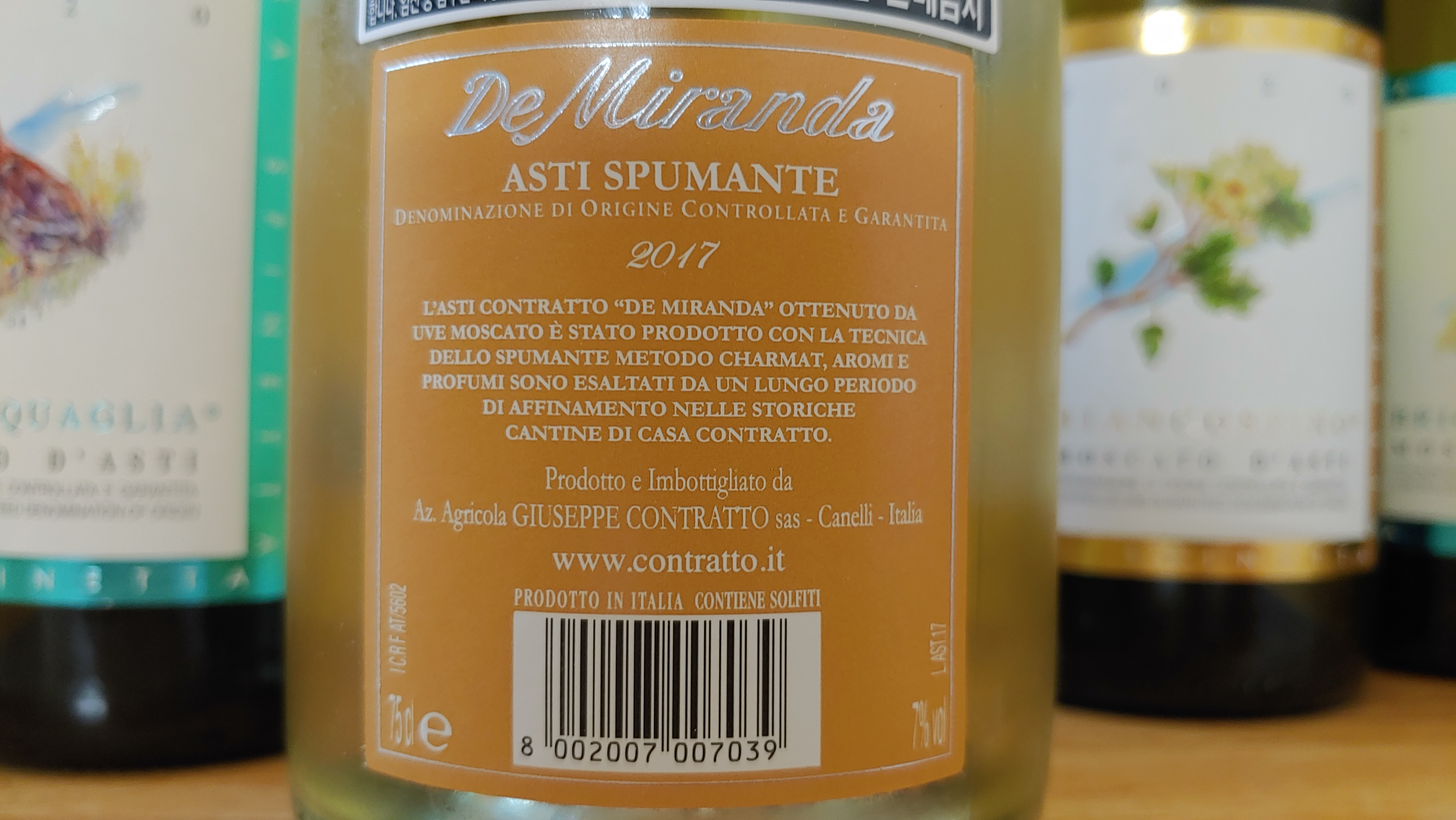 이건 콘트라토에서 만든 드 미란다 아스티 스푸만테(De Mirada Asti Spumante). 아스티 스푸만테는 모스카토 다스티와 같이 모스카토 100%로 만들지만, 모스카토 다스티에 비해 버블의 힘이 더 강해 샴페인처럼 뮈즐레로 마감을 한다. 알코올 함량도 7% 전후로 5% 안팎인 모스카토 다스티에 비해 더 높다.