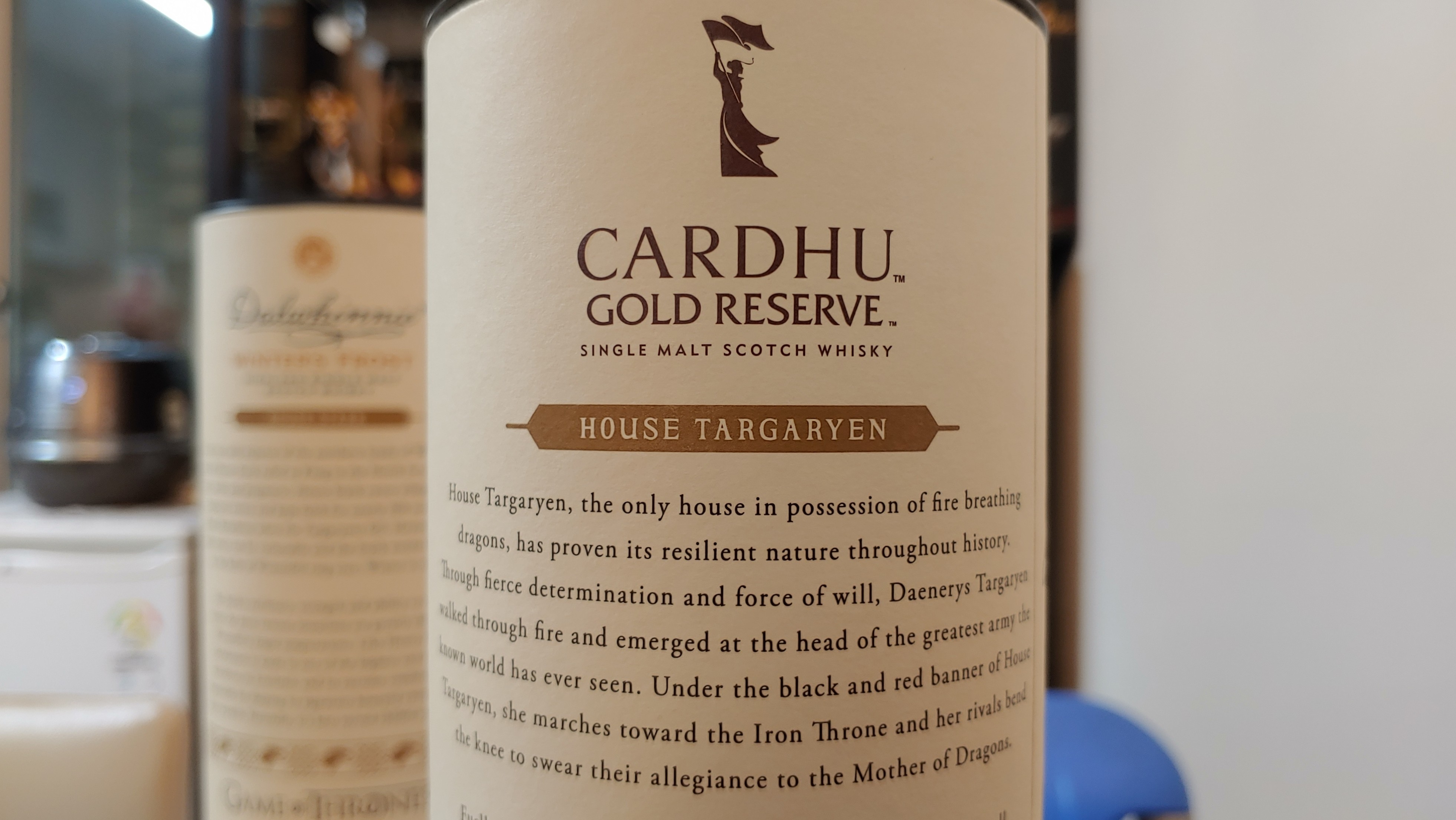 시리즈 전체적으로 시음평이 좋지 않지만, 예쁜 건 피하라는 격언에 딱 들어맞는 케이스 내가 산 두 종의 평은 특히 높지 않은 편이다. 그런데도 두 위스키를 산 이유는 두 위스키가 대표하는 가문이 드라마의 주인공들이기 때문이다. 게다가 스타크 가문(House Stark)의 문장인 'winter is coming'과 위스키 이름인 Winter's Frost는 이 계절에 딱이지 않은가. 카듀의 경우는 디아지오 스페셜 릴리즈 2019(Diageo Special Release 2019) 시리즈에서 맛보고 반해서 정규 라인업도 맛보고 싶었는데, 왕좌의 게임 에디션의 이름이 정규 라인업인 골드 리저브(Gold Reserve)와 같아서 구매했다. 아마 내용물은 같지 않을까 싶은. 어차피 빠른 시일 내에 뽕따해서 맛도 보고 칵테일에도 사용할 생각으로 산 거니까.