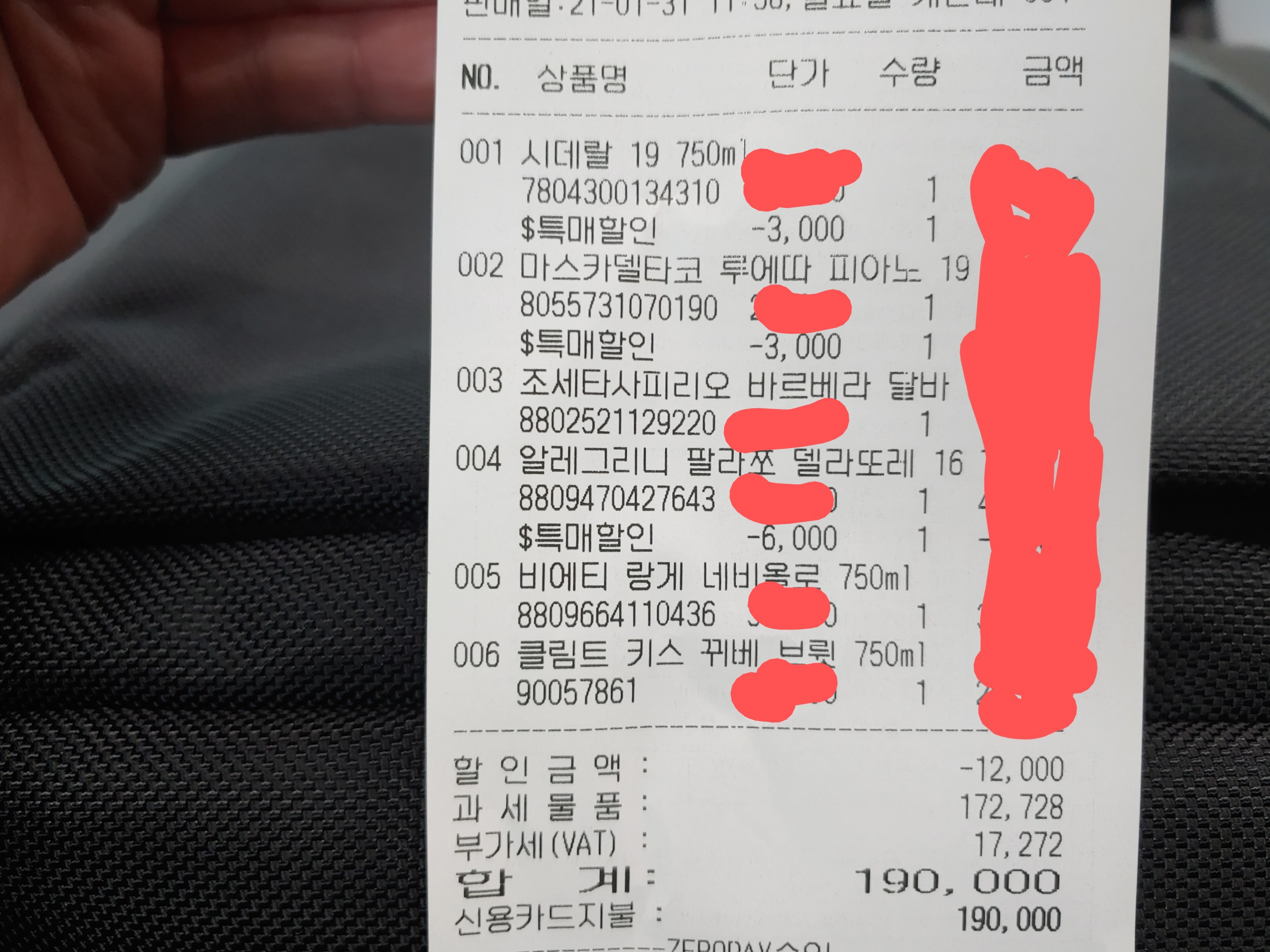 사전 정보를 통해 노리던 와인과 위스키가 각 1병씩 있었는데, 그 두 병은 안 사고 다른 것들만 사 왔다;;; 첫 방문인 만큼 오랜만에 봤거나 궁금한 것 중심으로 목표를 수정. 그래도 대략 생각한 예산과 비슷한 수준으로 맞췄다. 2병 값으로 6병ㅋㅋㅋ