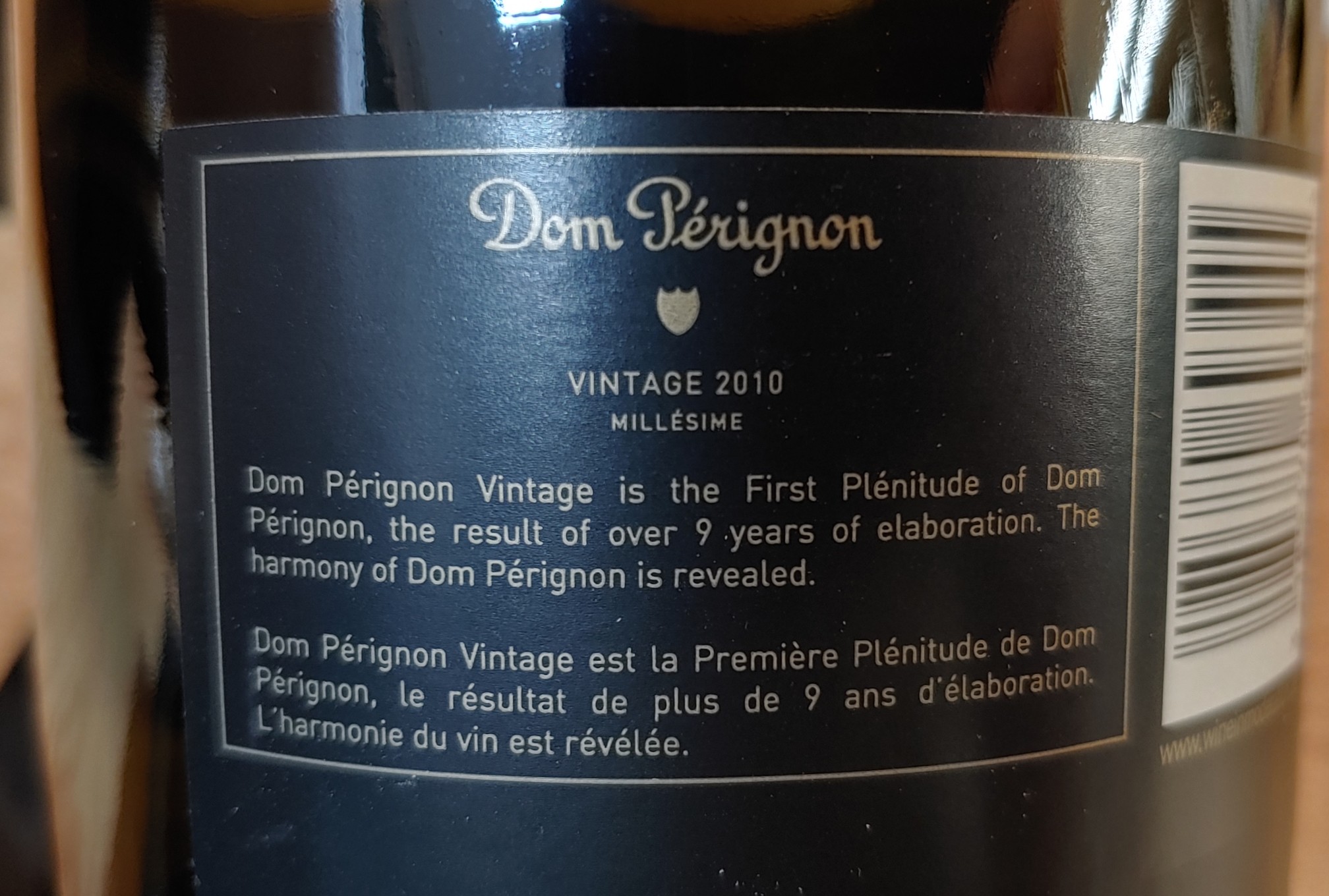 위 기사에 2010년 빈티지 출시의 비화가 상세히 실려 있다. 요약하면 동 페리뇽의 쉐프 드 카브(Chef de Caves)인 뱅상 샤프롱(Vincent Chaperon)은 7-800개의 플롯 별로 매우 정밀한 역동성과 진화 지도(very precise cartography of the dynamic and the evolution)를 만들고, 이를 기반으로 과감한 결정을 내릴 수 있었다. 그들은 대부분의 피노 누아를 보트리티스로 잃을 것을 알면서도 생리적 숙성을 얻기 위해 20%의 피노 누아를 3주 이후에 수확했고, 이를 통해 수확량은 적지만 충분히 익은 포도를 얻을 수 있었다. 덕분에 피노 누아와 샤르도네 모두 지난 10년 중 3번째로 높은 당 함량, 2번째로 높은 산도를 동시에 달성할 수 있었다. 풍부한 과일 풍미와 신선함을 동시에 얻은 것.