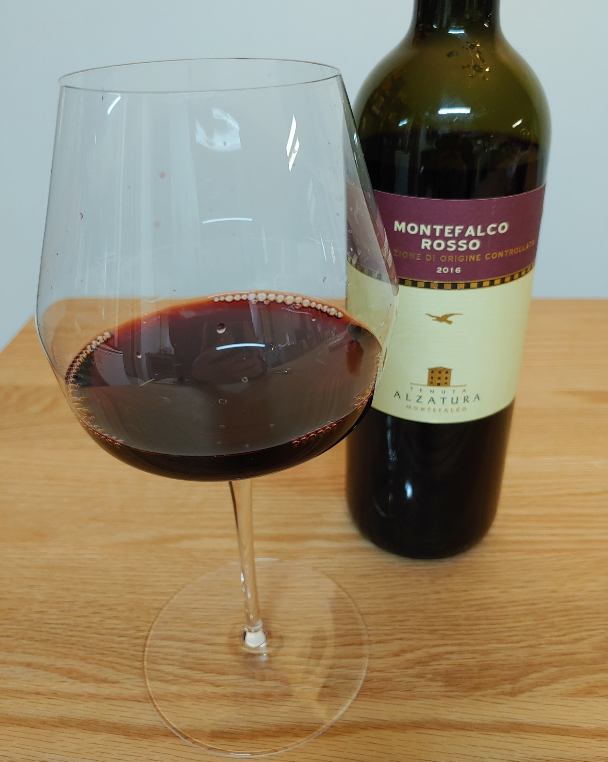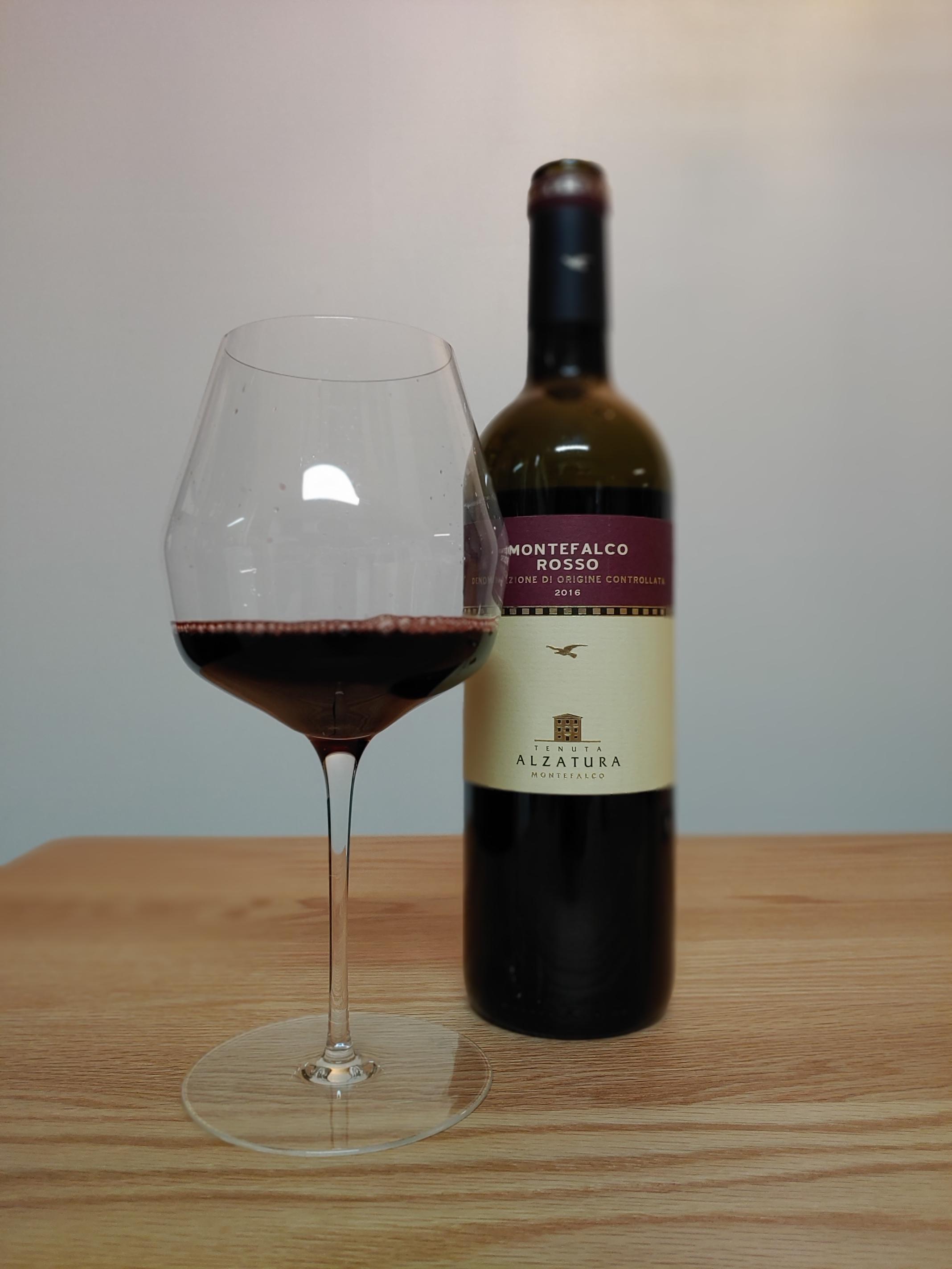 테누타 알자투라 몬테팔코 로쏘(Tenuta Alzatura Montefalco Rosso). 테누타 알자투라는 토스카나 기반의 가족 경영 와이너리 파밀리아 체키(Familia Cecchi) 소유의 와이너리다. 몬테팔코는 움브리아 중부에 위치한 와인 산지로 토착품종인 사그란티노(Sagrantino)로 알려져 있다. 사그란티노는 껍질이 두꺼워 타닌 함량이 많고 생산량도 적은 품종으로, 견고한 구조에 힘이 넘치는 장기 숙성형 와인인 사그란티노 디 몬테팔코(Sagrantino di Montefalco) DOCG을 만든다. 사그란티노 몬테팔코는 오크 숙성 최소 12개월 포함 37개월의 숙성을 거친 후에야 출시될 수 있다.