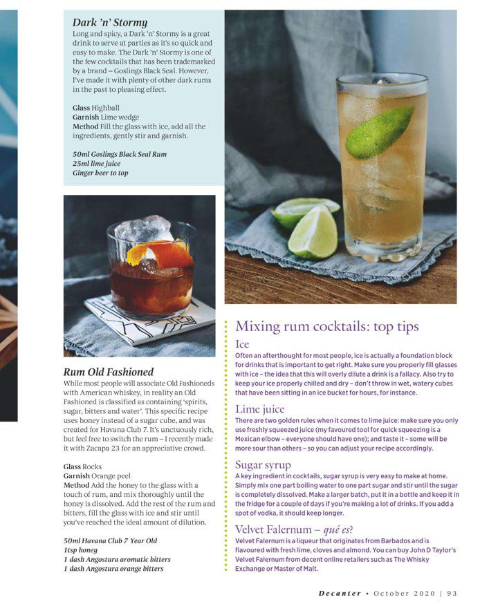 작년 10월 <디캔터(Decanter)>에 실렸던 럼 칵테일(Rum cocktails) 특집 기사. 대표적인 럼 칵테일 다섯 가지가 실렸는데, 그중 내 마음을 잡아 끈 두 가지 칵테일이 같은 페이지에 실려 있었다. 둘 다 다크 럼(Dark Rum)을 사용하는 레시피이기도 해서 같이 만들어 보았다.